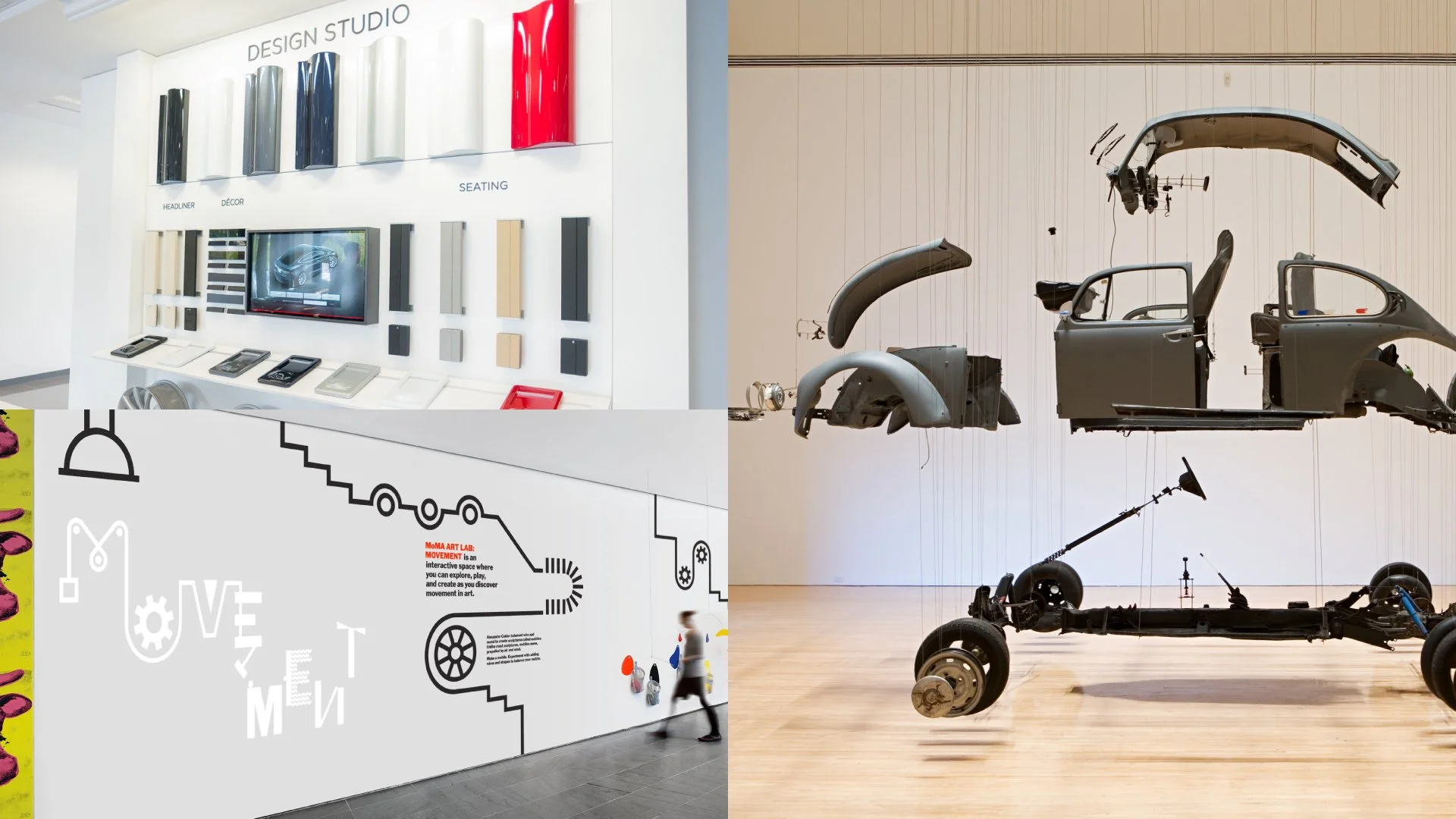 Our inspiration for the space came from car showrooms like Tesla, where they lay out the different pieces to personalize your car (pictured on the top-left). MoMA Art Lab: Movement inspired the museum-like exhibits in the store (shown on the bottom-left). Damian Ortega’s Cosmic Thing VW Beetle dissected) inspired the exploding couch displayed in the store window.